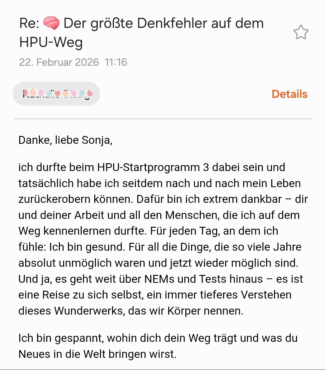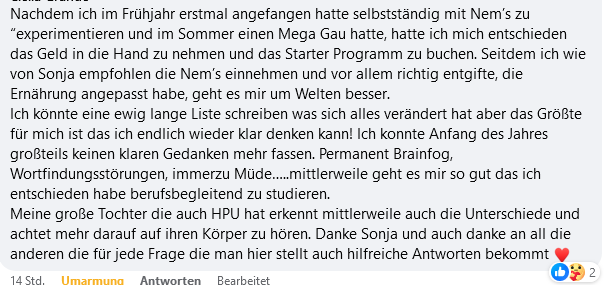 Ich durfte beim HPU-Startprogramm 3 dabei sein und tatsächlich habe ich seitdem nach und nach mein Leben zurückerobern können. Es geht weit über NEMs und Tests hinaus – es ist eine Reise zu sich selbst.