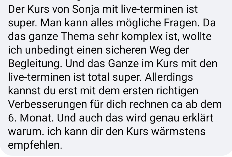 Der Selbstlernkurs gibt dir alle Inhalte – du arbeitest sie eigenständig und in deinem Tempo durch. Der betreute Kurs läuft über 4 Monate mit zwei Live-Calls pro Monat (je 90 Minuten) mit Sonja und direktem Feedback, sowie einem Forum, in dem du jederzeit deine Fragen stellen kannst. Wenn du schneller vorankommen, Unsicherheiten klären oder einfach nicht allein durch den Stoff möchtest, ist der betreute Kurs die bessere Wahl.