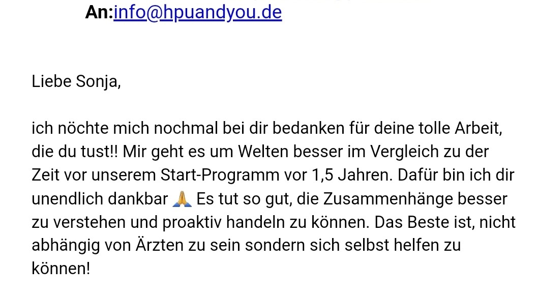 Aus dieser Erfahrung heraus habe ich HPU and You aufgebaut. Das Herzstück meiner Arbeit ist das HPU-Start-Programm, das bereits hunderte Menschen auf ihrem Weg raus aus Symptomen wie Erschöpfung, Reizdarm, Migräne, Ängsten… begleitet hat.