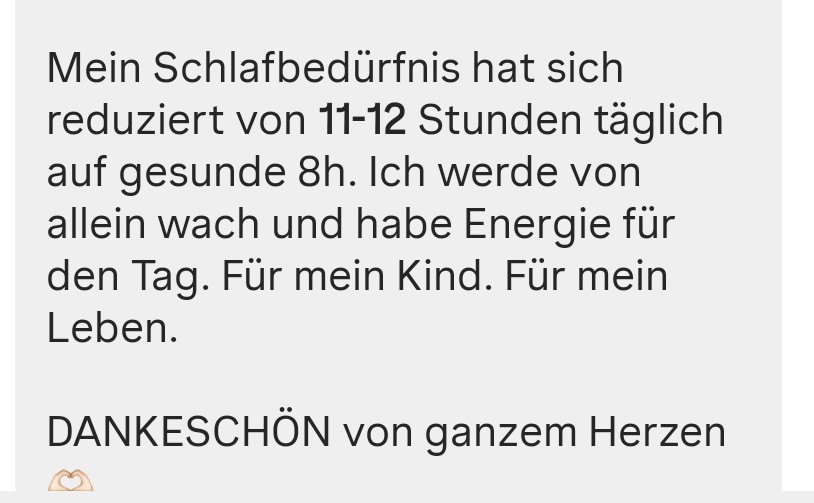 Mein Schlafbedürfnis hat sich reduziert von 11–12 Stunden täglich auf gesunde 8h. Ich werde von allein wach und habe Energie für den Tag. Für mein Kind. Für mein Leben.